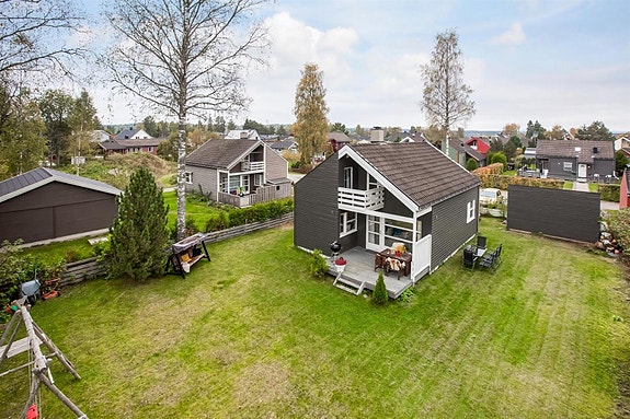 Hagebyen 16 er en tiltalende og sjarmerende enebolig med idyllisk og solrik beliggenhet i rolige Hagebyen på Nordkisa. Eneboligen har nærhet skoler, butikker og offentlig kommunikasjon, men ligger likevel godt skjermet fra trafikk. Eiendommen er pent opparbeidet med frodige beplantninger og stort plenareal med uthus og boltreplass for store og små. Fra stue er det utgang til herlig terrasse med trapp til hage, og fra loftsetasje er det utgang til koselig balkong. Det er parkeringsplasser på gårdsplass. Innvendig er eneboligen smart konstruert med arealeffektive løsninger og arkitektonisk særpreg. I første etasje er det entré med åpen garderobeløsning, en romslig gang, et pent soverom, bad med nyere innredninger, stue med peis og moderne, stilrent kjøkken i åpen løsning. I loftsetasje er det et flott soverom med bodrom og et innredet rom anvendt som soverom. Kjelleretasje består av et praktisk vaskerom, stor bod og en romslig kjellerstue som i dag anvendes som kombinert tv-stue og soverom.