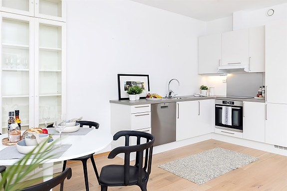 Med ekstra takhøyde i stue/kjøkken (ca. 2,6 meter) gir det god romfølelse og store vinduer slipper inn godt med lys. Kjøkkeninnredning fra Sigdal i pen, hvit utførelse. Hvitevarer på kjøkken medfølger handelen.