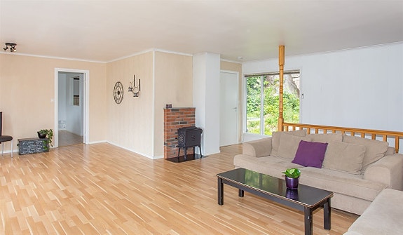 Fra vaskerom er det utgang til bakside. Fra stue utgang til stor veranda på fremside.
