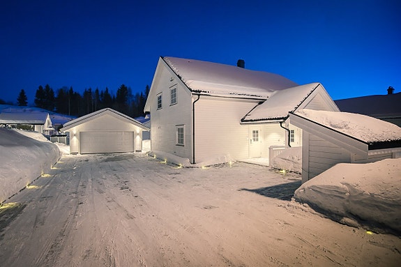 - Garasje har dobbel leddport med fjernstyrt portåpner og boddør samt strømuttak.