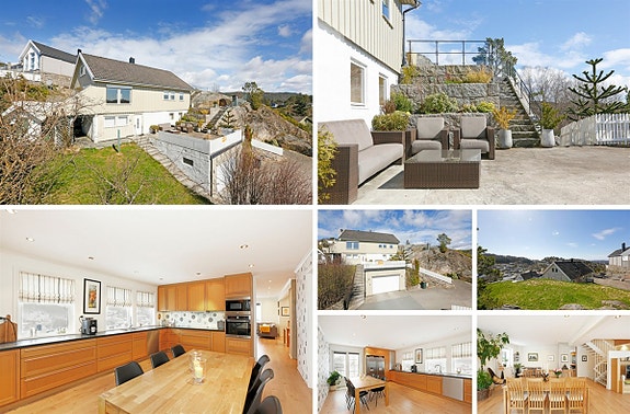 Innholdsrik og romslig familiebolig på Frøysland. Innh: 1.etg: Gang, hall, baderom, tv-stue, soverom, vaskerom, matbod og 3 boder. 2.etg: Gang, stort kjøkken med utgang til solrik og usjenert terrasse, soverom, baderom, spisestue og stue med utgang til hage/terrasse med utsikt og gode solforhold. 3.etg: Gang, 4 soverom og toalett. Garasje ved inngangsparti med hyggelig terrasse på taket. Flott hagestue som er fin å bruke på kalde dager med mye vær og vind. (Hagestuen er ikke søkt om til Mandal kommune.