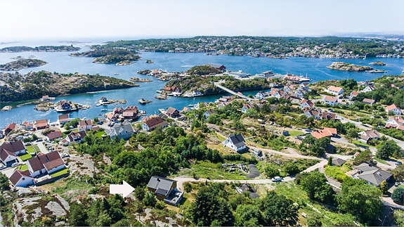 Dronebilde over eiendommen som er nær sjøen på Flekkerøy
