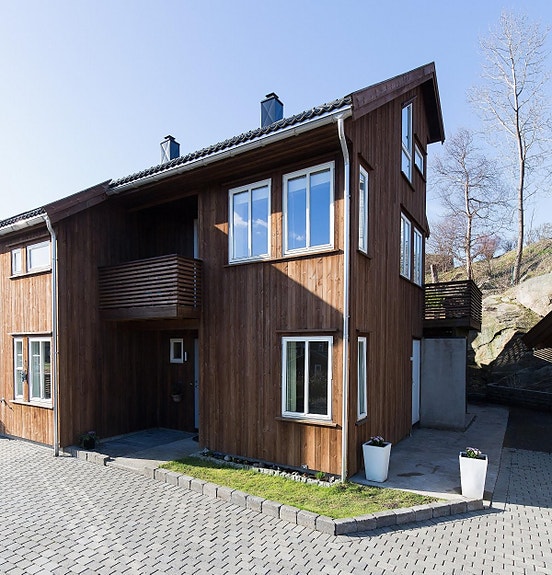Vertikaldelt tomannsbolig over tre plan oppført i trekonstruksjon på mur.