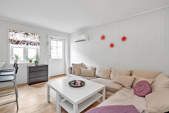 Innvendig er eneboligen lys og moderne, og inneholder vindfang, tre soverom, pent flislagt bad med opplegg til vaskemaskin, pent kjøkken fra Strai med integrerte hvitevarer og en lys og koselig stue med utgang.