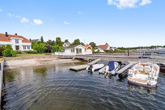 Fra eiendommen er det 180 grader utsikt utover sjøen. Fjærholmen med badesteder, sandstrand og et flott seilermiljø ligger rett over sundet.