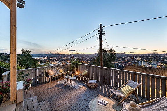 Hjertet av andre etasje er en romslig stue som har fantastisk utsikt over byen og gir deg en helt unik opplevelse av å bo i høyden. Etter mørkets frembrudd blir lysene fra byen et pent skue å hvile øynene på. Etasjen har i tillegg en vestvendt veranda hvor du kan få med deg solnedgangene i svært luftige omgivelser.