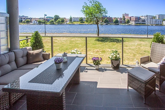 Flott utsikt fra den fliselagte terrassen ut mot Otra og over mot byen