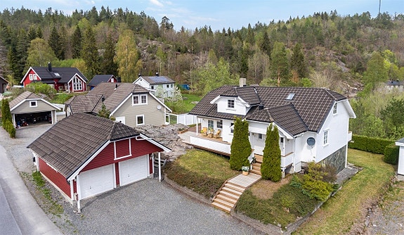 Innholdsrik familiebolig med bl.a. 6 soverom og tilhørende dobbelgarasje med lagringsloft.