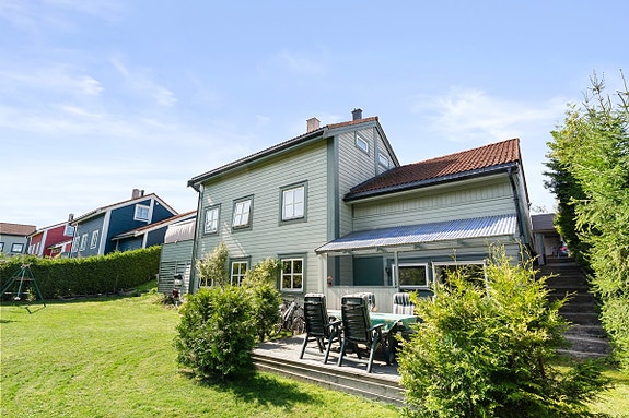 Lys og tiltalende enebolig med god beliggenhet. Stor hage, solrike uteplasser, romslig praktikantdel og dobbelgarasje.