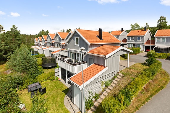 Tiltalende enebolig i rekke i et populært og barnevennlig område på Fjellstrand. Boligen ligger vestvendt med svært gode lys- og solforhold. Lys og luftig stue med utgang til terrasse på ca. 12 kvm. 4 gode soverom hvorav det ene med utgang til overbygget uteplass. Boligen er oppusset de siste år med blant annet oppgradert bad i 2. etg. Hage på tre av husets sider med sol fra morgen til kveld. Hagen er pent opparbeidet med plenarealer og rikelig med beplantninger. Innbydende adkomst med steinlagt gårdsplass. Terrengtilpasset trapp på utsiden av carport og bod mot syd. Hyggelig, felles lekeplass for beboere på området. Kort gangavstand til barneskole, barnehager samt fine turområder. 15 min. gange til Fjellstrand badestrand. Buss som korresponderer med båt til Lysaker og Aker Brygge