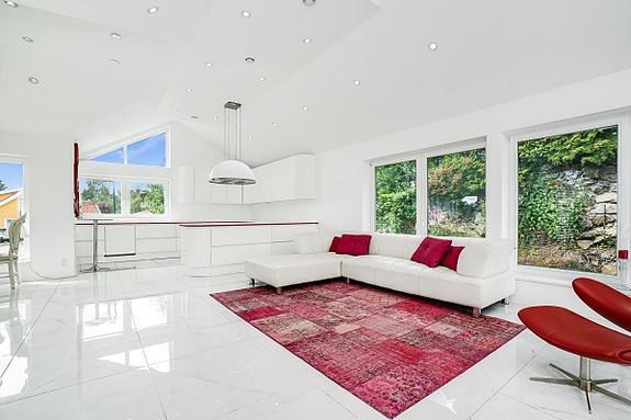 Inne er det benyttet kostnadstunge materialvalg og en rekke særegne innredninger som gjør dette til en helt unik bolig. Hele toppetasjen er viet til stuen og kjøkkenet som danner et stort allrom. På kjøkkenet er det Pedini-innredning med et rikt utvalg integrerte hvitevarer. Boligen har to flislagte bad, det ene med tropedusj og nedfelt boblebadekar. Videre er det vaskerom, tre pene soverom og et innredet kjellerrom anvendt som et fjerde soverom.