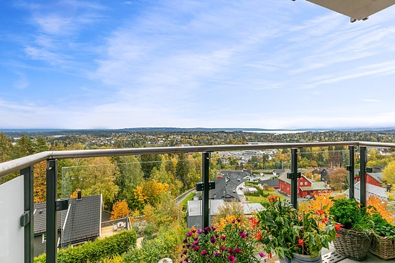 Lys og tiltalende 4-roms leilighet i 2.etg. med panoramautsikt - 2 solrike balkonger - God lagringsplass og garasje!