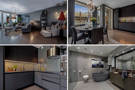 SOLGT FØR VISNING. Lekker leilighet i Bragernes Atrium. 2 balkonger. Garasje. Heis.
