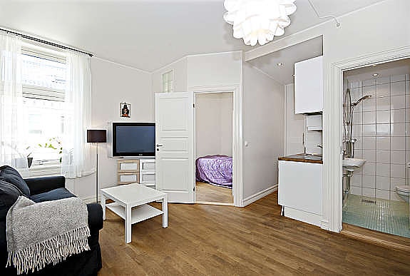 Stue, åpen kjøkkenløsning, sovealkove, bad. Det opplyses at leiligheten disponerer en kjellerbod
