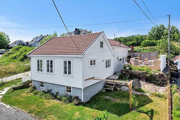 Lillesand - Idyllisk og flott sørlandshus med solrik beliggenhet like ved sentrum. Utsikt og gode parkeringsmuligheter.