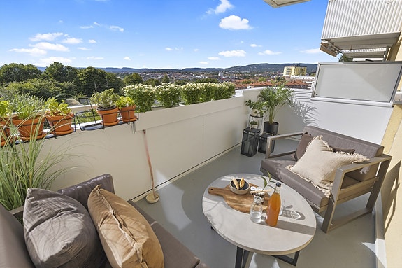 - Vestvendt og romslig balkong med herlige solforhold og nydelig panoramautsikt over Oslos tak