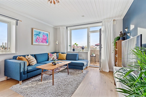 Gjennomgående 3-roms topp- / endeleilighet med balkong. God rehab. historikk. Flotte grøntområder. Parkeringsleie.