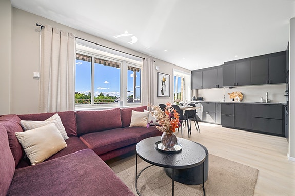 Kjøkken og stue med en åpen og sosial løsning. Flere store vindusflater og dør ut mot balkongen. Fantastiske lys-og solforhold.