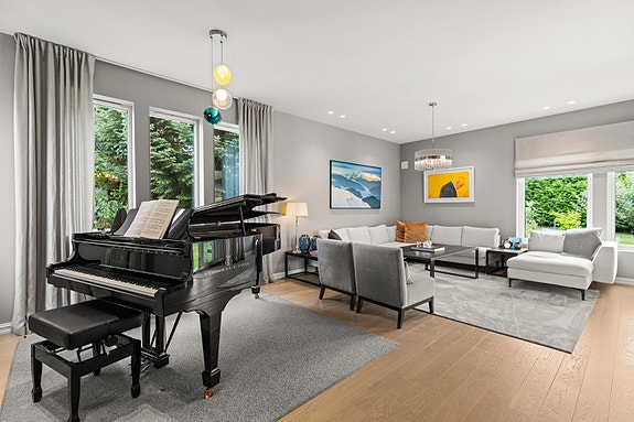 Stuen har 1-stavs parkett, lysmalte veggoverflater og downlightsbelysning i deler av himling.