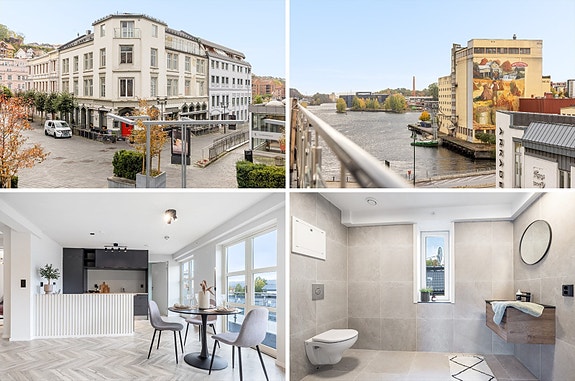 Strøken, unik og meget pen leilighet med lekre moderne detaljer. Romslig solrik balkong med flott utsikt til elven og til torget.