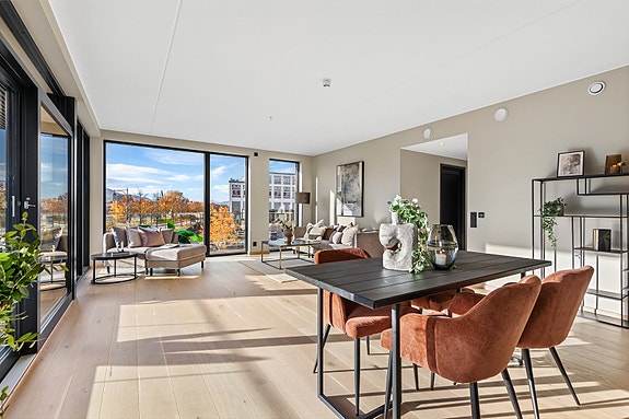 - Åpen stue-/kjøkkenløsning med store glassflater