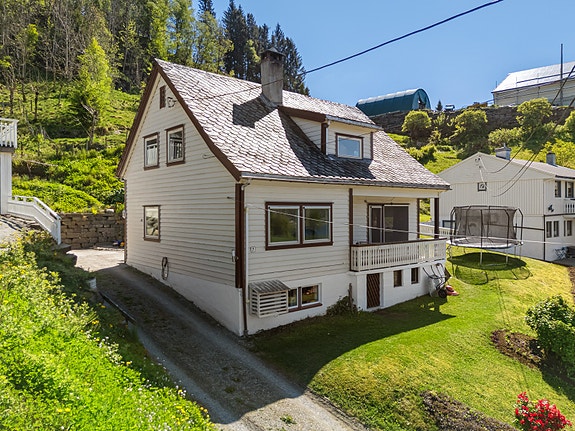 Enebolig over to plan pluss kjeller, med sentrumsnær, barnevennlig og landlig beliggenhet, bare 5 minutter fra Voss sentrum. Herfra har man kort vei til skoler, barnehage og butikker. Nydelig utsikt mot Raugstad, Hanguren, Lønahorgi og deler av Vangsvatnet, og kveldssolen kan nytes til langt på kveld. Boligen har gjennomgått diverse innvendig oppgradering siste år, med gjennomgående lyse, pene overflater og enstavs laminatgulv. Her er fire soverom, to stuer, bad, vaskekjeller og rikelig med bodareal. God plass til parkering på eiendommen. Fra stuen har man utgang til veranda og videre tilgang til et opparbeidet og beplantet uteområde med plenareal og murer.