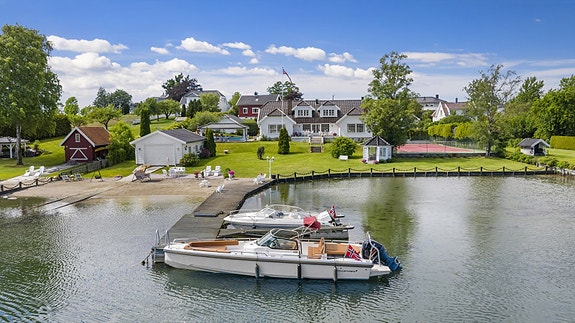 Stor herskapelig villa med vakker hage, tennisbane, basseng, egen strandlinje, båthus, stor brygge. Nydelig beliggenhet!