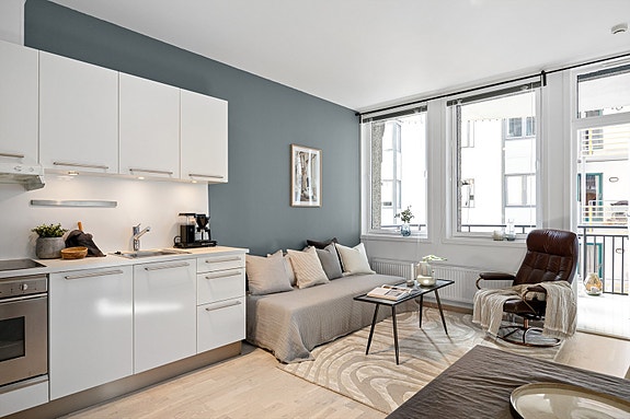 Pen, lys og arealeffektiv 1-roms leilighet med sydvestvendt balkong - Varmtvann og fyring inkl. - To felles takterrasser