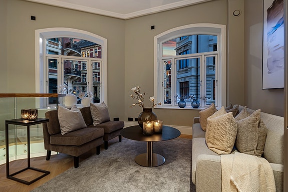 Selve hjertet i boligen er det kvalitetsrike spisekjøkkenet, omkranset av store vindusflater for rikelig med naturlig lysinnslipp og god takhøyde. En praktisk spisestue/lounge i bakkant av kjøkkenet byr på flere bruksmuligheter. Leiligheten innehar videre to generøse stuer i underetasjen, hvorav én har peis, to delikate velværebad samt tre soverom av gode størrelser. Eksklusiv designtrapp binder etasjene sammen.