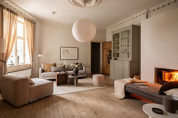 Med takhøyde på bl.a. 3 meter, fiskebensparkett, rosett, Carrara marmor og svært god finish, utstråler boligen et klassisk og herskapelig preg.