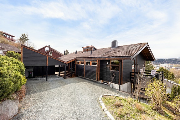 Nydelig, arkitekttegnet enebolig med ypperlig beliggenhet på Hoeggen. Romslig gårdsplass og carport med plass til to biler, samt rikelig med lagringsplass på hems.