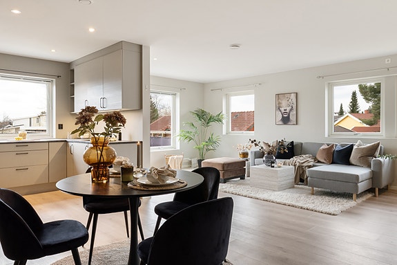 Flott kjøkken av typen Aubo med integrerte hvitevarer. Pent laminatgulv fra Pergo med vannbåren varme i alle oppholdsrom og varmekabler på bad. Lekkert baderom med tidsriktige farger med dusjhjørne, vegghengt wc og servant med underskap. Leiligheten har en innvendig bod/tekniskrom. Balansert ventilasjon med varmegjennvinning.