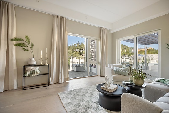 Toppleilighet med stor takterrasse og balkonger. Ekstra takhøyde. 2 p-plasser.