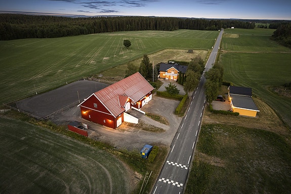 1. etasje: 9 stallplasser og to utebokser, Forrom og plass til lagring av høy, Salrom, Vaskespilt, Sykeboks og Verstedbu. Plass for oppsaling.