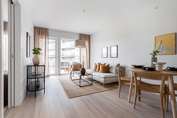 Leiligheten er moderne, lettstelt og gir en god romfølelse. Det er høy kvalitetsstandard og gode materialvalg. Fargene er dempet, slik lar de seg lett kombinere med møblene dine. Stilen er lys og naturlig, sammen legger de fundamentet for en lun og harmonisk atmosfære.