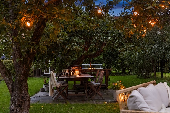 Fra boligen har man enkel tilgang til en vakker hage av sjelden god størrelse. Hagen er pent opparbeidet med en rekke planter og prydvekster i alle farger og fasonger, og skaper en lun og solrik oase til glede året rundt. Eiendommen har et hyggelig indre gårdsrom med rolige internveier som skaper trygge og flotte omgivelser. Det er ekstra lagringsplass i kjellerbod på 7 m² og utebod på 4 m².