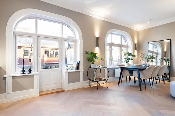 Her får du en fin kombinasjon av det klassiske om moderne med luftig takhøyde, rosett, stukkatur og store vindusflater.