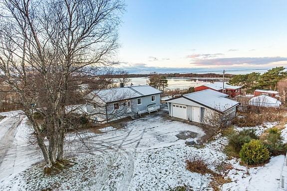 Tomten er opparbeidet med steinlagt innkjørsel, plen- og buskareal og terrasse. Parkering på egen tomt og i garasje (55 kvm).