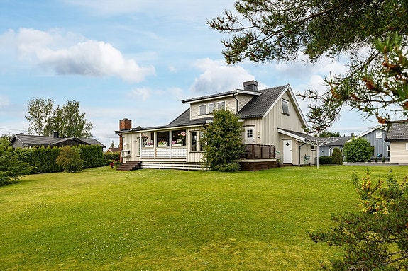 En stor, flott og solrik eiendom som er bebygd med en pen og godt vedlikeholdt enebolig. Boligen har en god planløsning med 3 stuer, kjøkken, bad og vaskerom i 1. etasje, samt 3 soverom og bad i 2. etasje. Spisestuen ble tilbygget i 2007, samtidig ble også vinduene byttet og det ble bygget ny terrasse med takoverbygg. Kledningen ble byttet i 2009. Innvendig fremstår boligen romslig, lys og pen. Eiendommen er også bebygd med en dobbelgarasje på 50m² og en frittstående redskapsbod på 14m².