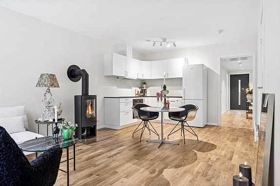 Boligen har en lettstelt og fin planløsning, med soverom i forbindelse med entré, bad/vaskerom og videre inn i en åpen stue-/kjøkkenløsning. Hovedsoverommet er romslig, med bod/walk-in. Stor og fin balkong mot sydvest, utvendig bod på bakkeplan og 2 faste biloppstillingsplasser.
