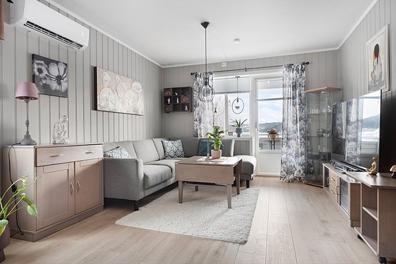 Oppusset og pen leilighet, med fin utsikt. Gangavstand til "alt". Fellesutg inkl renter/avdrag, tv/internett, kom. avgifter ect