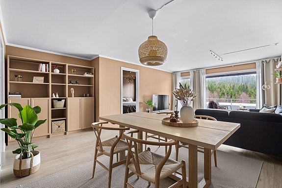 Dette er en gjennomgående 3-roms leilighet med god standard og praktisk planløsning. Her får du stor stue, separat kjøkken. to gode soverom samt et flislagt bad. Fra stuen er det utgang til en herlig balkong på hele 17 m², og bilen kan parkeres i garasjen.