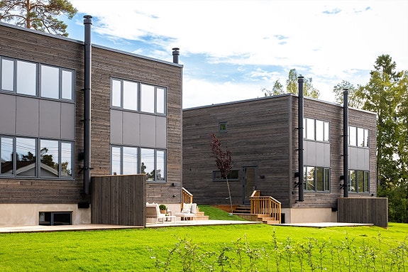 Nyoppført vertikaldelt halvpart av en tomannsbolig med høy standard. Peis, underjordisk garasje og solrike uteplasser.