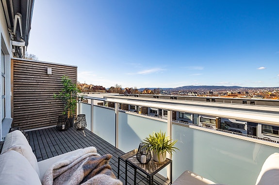 Tilbaketrukket fra bykjernen finner du denne flotte 5-roms leiligheten som går over 2 plan med gjennomgående planløsning i begge etasjer. Her har du mye av de samme kvalitetene som å bo i et rekkehus med blant annet 2 toaletter og 4 soverom, stor stue, terrasse, spisekjøkken og gode oppbevaringsmuligheter. I borettslaget er det mulighet for leie av garasje-/p-plass. Fra leilighetens store vinduer er det fantastisk utsikt over byen. God offentlig transport med nærmeste holdeplass i Ryenbergveien (Nr. 34 og 74), som ligger ca. 1 minutt gange fra boligen.