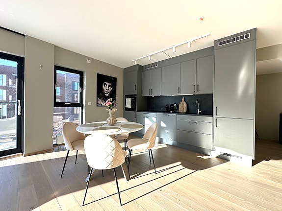 Lys, nyere og moderne 3-roms hjørneleilighet fra 2023 med 2 soverom og solrik balkong - Parkeringsplass -Vannbåren varme