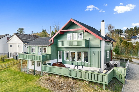 Attraktivt enebolig i populært og barnevennlig område. Hage og terrasser med gode solforhold. Stor dobbel garasje m/elbi