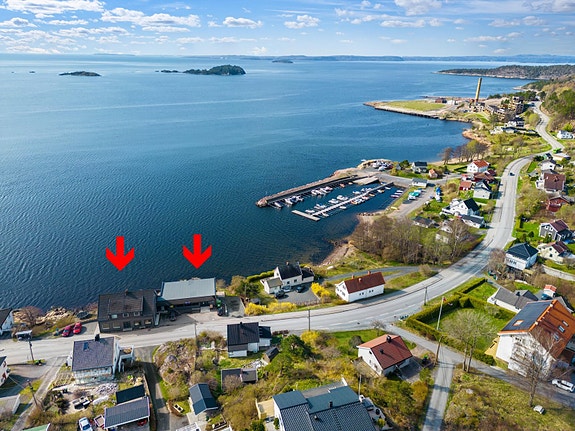 Kombinert eiendom helt i strandkanten på Tofte. Bolig - næring. Utviklingsmuligheter og rehbiliteringsbehov