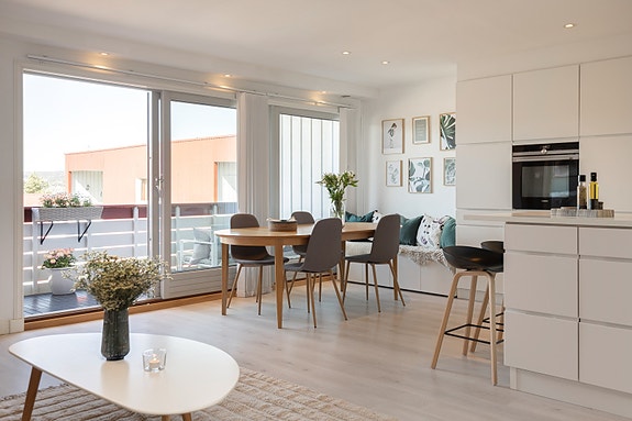 Flott toppleilighet beliggende i rolig område. Solrik balkong. Garasjeplass. Stilrent kjøkken. Fjernvarme inkl.