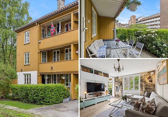 Nydelig tilbaketrukket 2(3)-roms med markterrasse | Garasje m lader | Ettertraktet småhusbebyggelse rett ved Akerselva