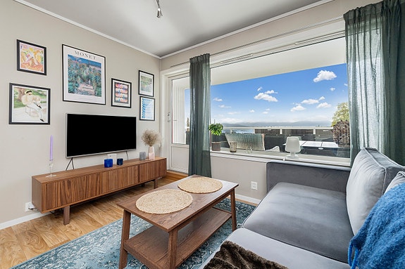 Pen og praktisk utsiktsleilighet med trappefri adkomst i veldrevet borettslag. Romslig veranda, parkering medfølger!